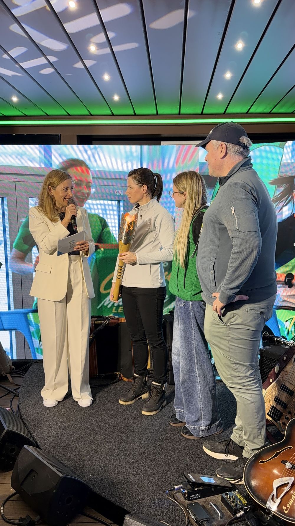 V Cortino jo je uspešno pripeljala ognjena navijaška ekipa, ki so jo sestavljali Vesna Fabjan, Ana Mačič Kotnik in Miha Deželak. Skupaj z baklo so pripeljali tudi zadnji Laško mlaj, sod piva in vso energijo, ki se je zbirala sedem dni v Planici.